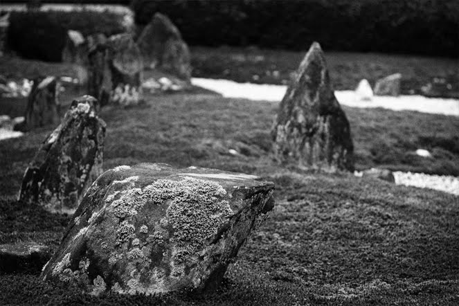 Ikasumi has an undisguised weakness for dry landscape gardens (karesansui). They are fascinating aesthetically, culturally, and historically, with shifting emphases through various eras. One way to think of the garden is that it concentrates all the energy and size of a mountain into a stone. Another is somewhat opposite - that the design tries to achieve an expansion to represent all of the universe. This was the trend in the Heian period (794 - 1185) when art and literature were emphasized by the aristocracy. The Kamakura era (1185 - 1333), saw increasing influence of zen meditation on gardens. Stones became less representational and more abstract. The much celebrated garden at Ryoan-ji is the best known example of this. In Japanese the phrase, yohaku-no-bi (literally, "the beauty of extra white") refers to the beauty of empty but articulate space, a recurring theme in Japanese aesthetics.